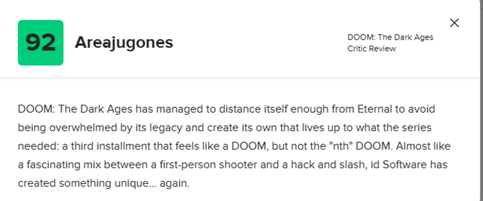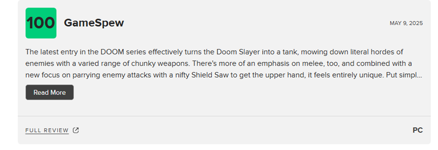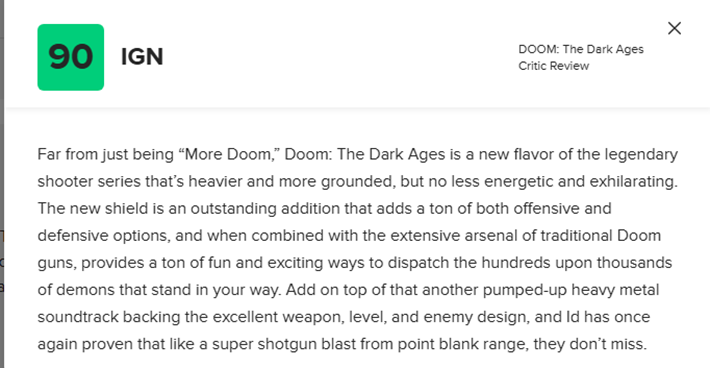 游戏媒体评价好玩的游戏不一定好玩,但是游戏媒体和玩家都说好的游戏,一般就是众望所归的好游戏,而《毁灭战士:黑暗时代(DOOM: The Dark Ages)》便是这样一款好游戏,现在让我们一起看一下本作的游戏媒体评价(部分):