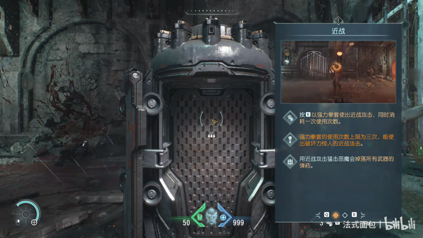 盾牌的加入势必导致近战元素的在游戏中的地位得到提升,近战攻击能够给恶魔带来成吨的伤害,而本作的近战武器有三种,分别是强力拳套、连枷以及畏忌战锤,用近战攻击敌人的时候视觉冲击是比较强烈的,拳拳到肉看起来非常的刺激,不过似乎是为维护FPS的内核,近战攻击的使用严格遵循三次的次数限制。近战攻击的次数需要通过完美格挡恢复或者地图拾取对应恢复近战次数的道具。