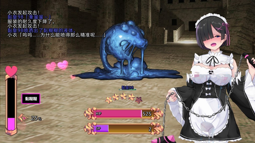 在游戏的玩法上,就是普通的rpg回合制那一套,但加入了本作的特殊机制,比如怪物会对角色发动涩涩攻击涨发情值,甚至还会对玩家的服饰造成伤害,达到爆衣的效果。