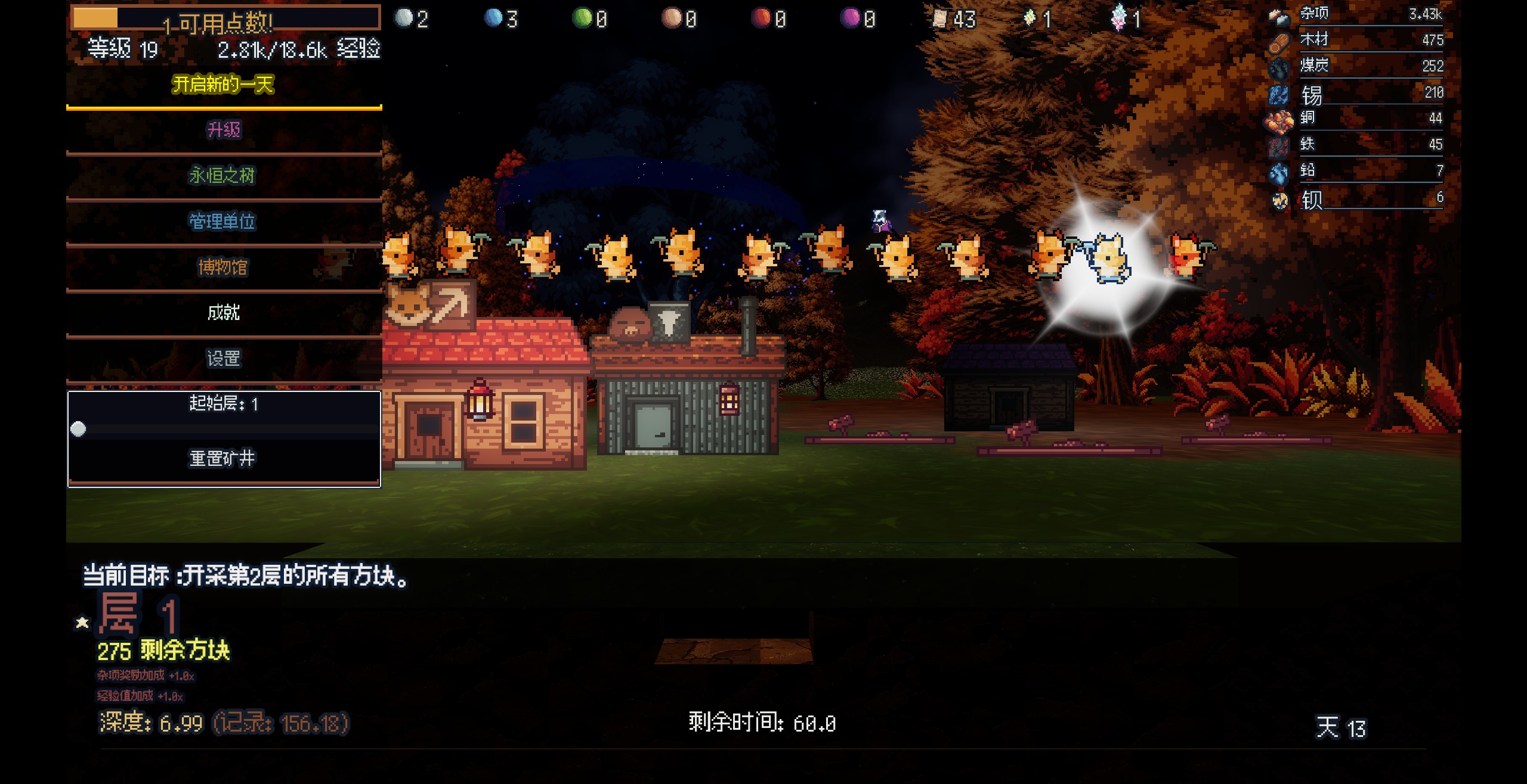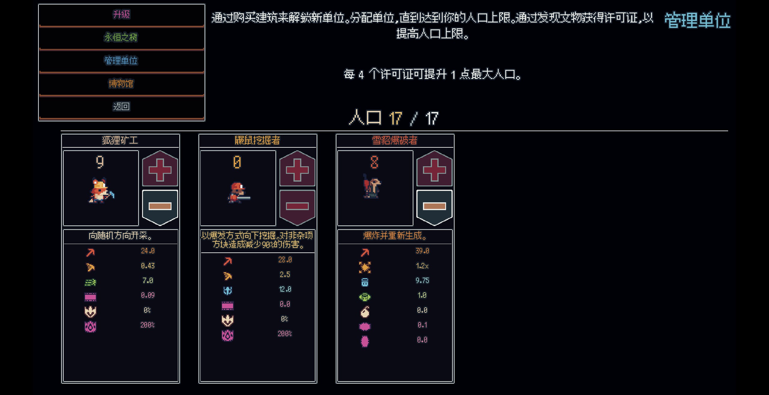 游戏里的动物族群也有着不同的工种,近乎全能的狐狸矿工、拿着钻土机拼命下钻的鼹鼠挖掘者、还有抱着炸药下去和矿藏同归于尽的雪貂爆破者等等,合理的提升他们的工具和天赋后,再合理的搭配他们的数量比例,能对我们的挖掘工作有着事半功倍的效果。