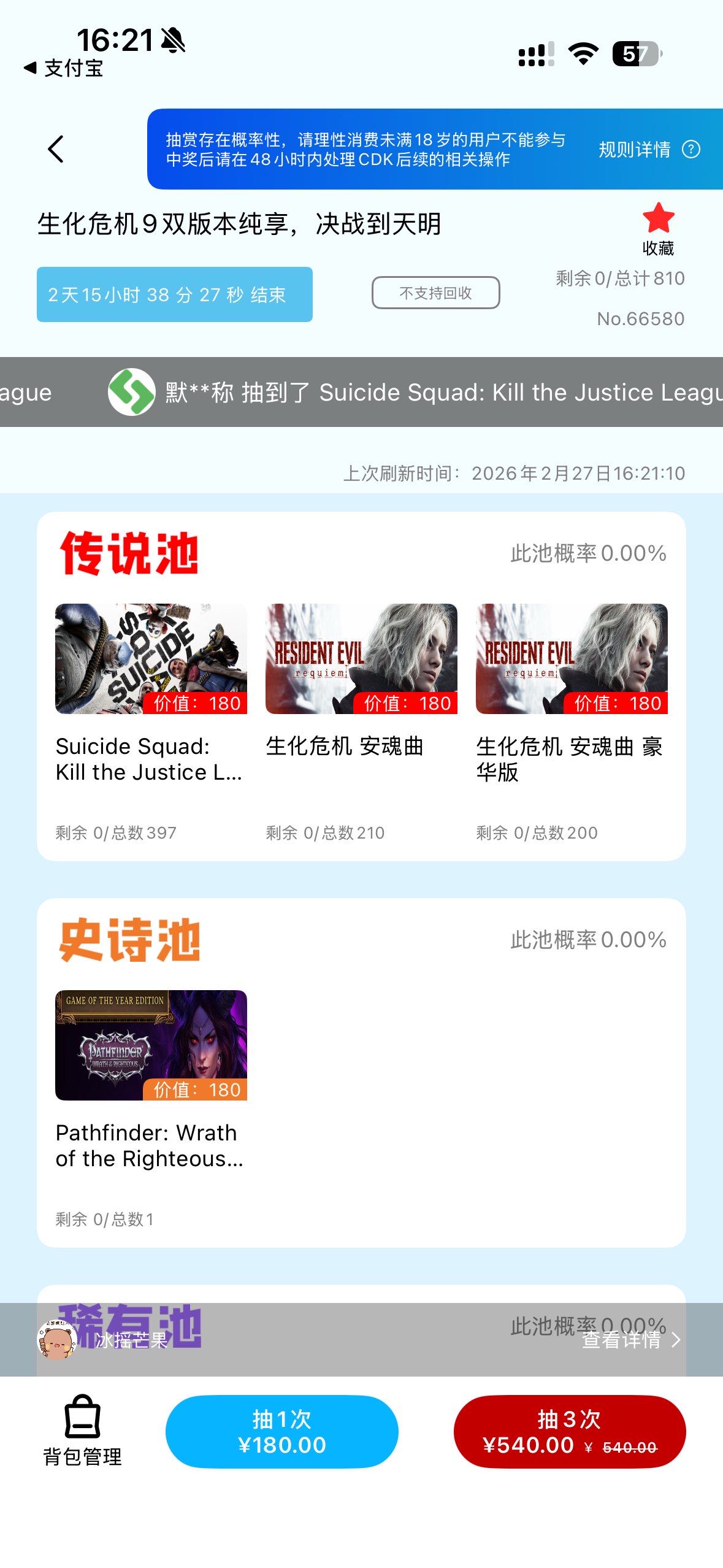 新的180池子是豪华版自杀小队,两百多个,不知道会降到几块钱