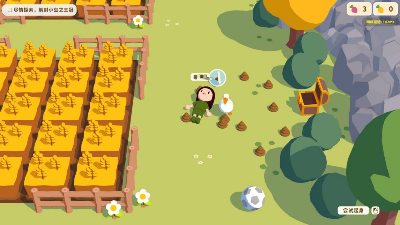 游戏支持多人联机!你可以和朋友在小岛上放空大脑随意自由自由探索,根据提示完成任务,或者是参与一些解谜小游戏和小玩具,又或者是拿游戏中的道具整蛊朋友(最喜欢变形大鹅去叨朋友哈哈),也可以种植蔬菜换硬币来玩扭蛋机。