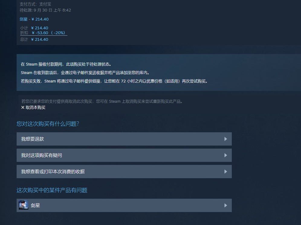 第一步把你要卡的游戏加入购物车第二步跳转至支付选择支付宝第三步出现支付二维码后直接关闭页面第四步前往steam客服页面,当近期产品中出现对应游戏卡单大法便完成了走过路过的别忘记手动留下一个🤡支持一下赞 11评论 2浏览 5345