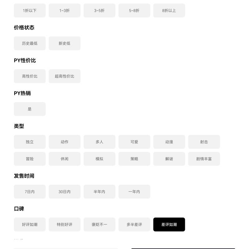 筛选功能确实做的不错,分类也比较全面,可点开进行细致筛选。发售时间可以增加到具体年份